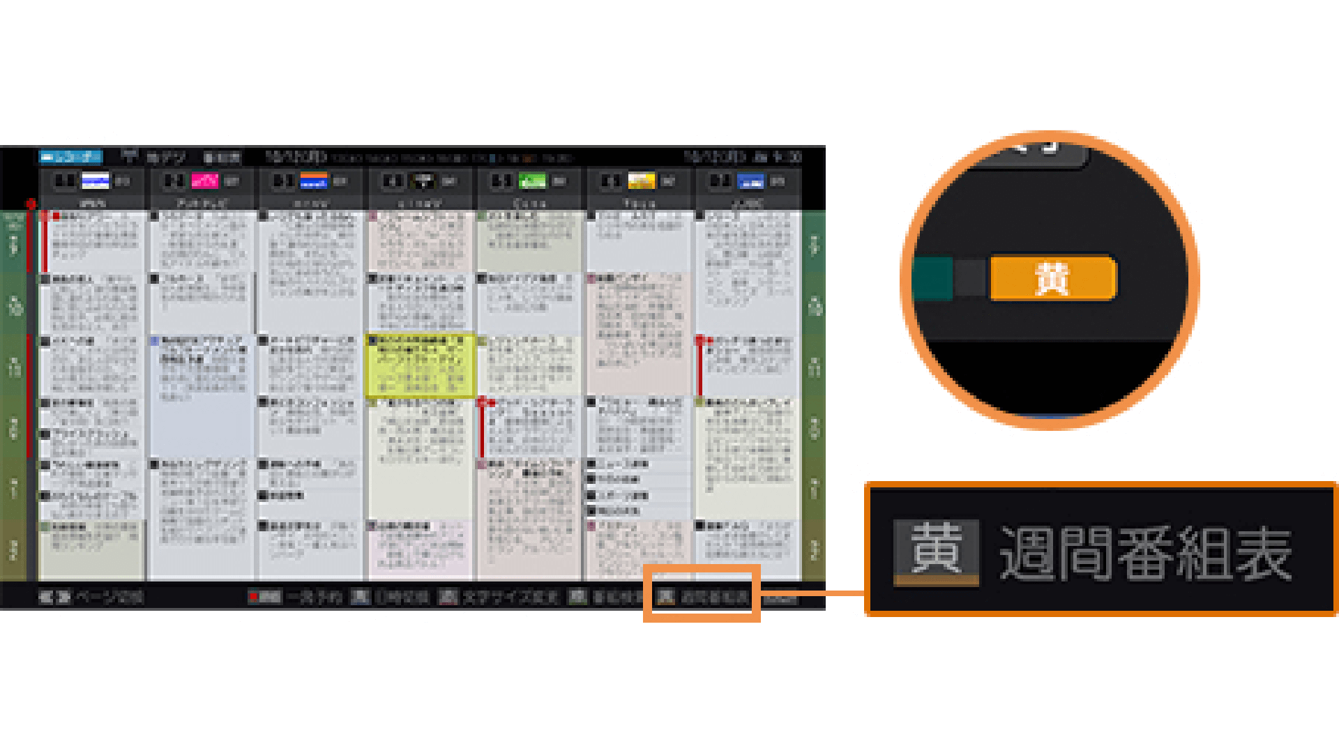 番組表はチャンネル別に表示することもできます。お気に入りのチャンネルだけを一週間分確認したいときに便利です。番組表表示時に、リモコンの黄色ボタンを押すことで切り換えることが可能です。